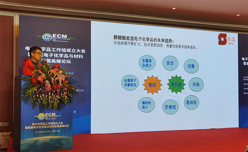 在首屆電子化學(xué)品與材料發(fā)展高峰論壇上,我公司研發(fā)一部劉涌同志做了精彩學(xué)術(shù)報告,《醇醚及其醇醚酯類濕電子化學(xué)品的應(yīng)用與展望》。講述了醇醚及其醇醚酯類濕電子化學(xué)品在溶劑類濕電子化學(xué)品中的應(yīng)用,其用于半導(dǎo)體、太陽能硅片、LED和平板顯示等電子元器件的光刻、清洗和蝕刻等工藝環(huán)節(jié)。具有技術(shù)門檻高、資金投入大、產(chǎn)品更新?lián)Q代快等特點。及該類產(chǎn)品的較大的應(yīng)用市場,主要包括二乙二醇甲醚醚、乙二醇丁醚、二乙二醇丁醚、丙二醇甲醚、丙二醇甲醚醋酸酯等。是微電子、光電子濕法工藝制程中使用的電子化工材料。